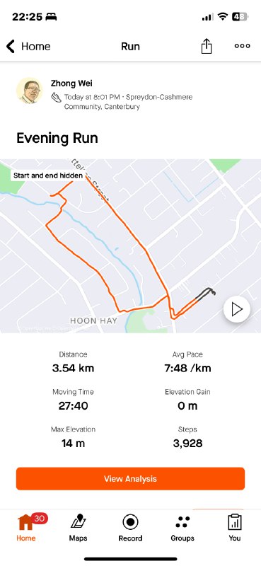 今天跑了 3.54 km,配速 7:48。我想到一个差不多5km的线路,明天可以考虑试试。
