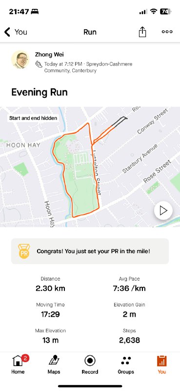 坚持跑步第7天。今天刻意迈较大的步子,速度有进步。
