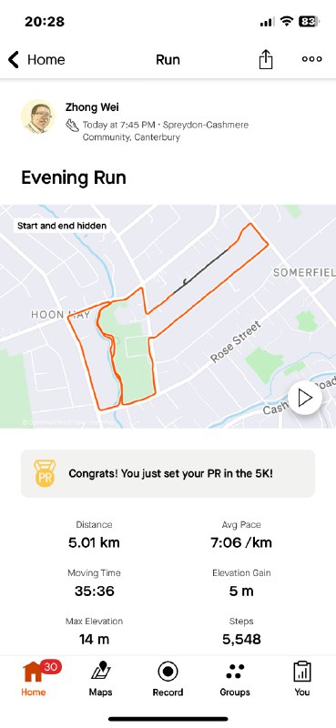 今天Y状态不佳,罢跑一天。那正好我可以一个人跑个痛快。这个路线是个闭环,几乎正好5km。于是今天跑了5.01km,配速7:06。对专业跑手这是不值得一提的速度,但我很满意。