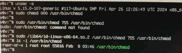 sudo /lib64/ld-linux-x86-64.so.2 /usr/bin/chmod 755 /usr/bin/chmod